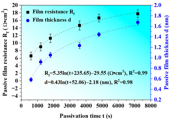 Figure 13 depicts the relationship between passive film resistance Rf and passive film thickness d as a function of passivation time t. It was discovered that film resistance is positively correlated with film thickness as time goes on. The simulated equations of growth trends of film resistance and thickness are determined as: