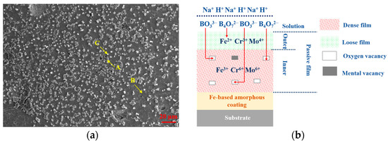The schematic mechanism of the synthesis of mechanical mixtures during the initial passivation step is depicted in Figure 14b. Note that the passivation rate of the amorphous coating is significantly quick, causing a rapid growth of an extremely thin but protective layer. However, due to a strong interaction between metal atoms and anions such as BO33− and B4O72−, a large number of brittle mechanical mixtures are readily adsorbed on the film surface. Metal and oxygen vacancies will be filled by the anions from the corrosive medium [61]. It has been reported that mechanical mixtures have a tendency to expand to some extent, which can contribute to mechanical stress in the passive film, potential deformation and film rupture [62]. In addition, the microcracks in the film will encourage direct contact between the coated surface and the electrolyte, which will speed up the pace at which metal ions dissolve and lead to the creation of additional mechanical mixtures. It is predicted that numerous mechanical mixtures will quickly prevent the coating from self-repairing and may even start pitting corrosion. Moreover, the rate at which mechanical mixtures diffuse into the electrolyte is much higher than the rate at which metal cations form passive films without mechanical binding [63]. Hence, the mechanical mixtures on the adsorbed surface will continuously dissolve into the corrosive medium and lead to local exposure of the coating to electrolytes in the later passivation process.