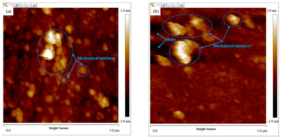 AFM topographies of passive films generated at 600 and 7200 s are shown in Figure 16. The film is seen to be clearly porous and severely faulty at 600 s, with apparent grain boundaries and the presence of a ball-shaped mechanical mixture normal to the coating surface. In contrast, the surface topography of passive film created at 7200 s contains several agglomerated mechanical mixtures and exposed holes. In particular, it is challenging to predict the grain size of passive oxides at 7200 s. However, the overall structure of the film passivated for 7200 s is more compact and denser. These results are highly consistent with SEM micrographs in Figure 14a and Figure 15a.