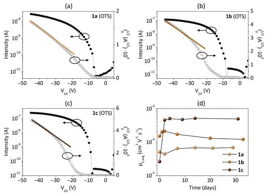 OTFT characteristics of OTS-functionalized devices based on compounds: (a) 1a; (b) 1b; (c) 1c. The evolution of μh of representative devices throughout a month is represented in (d).