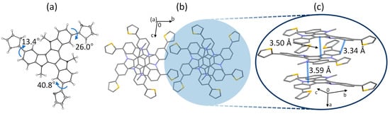 Crystal structure of derivative 1a: (a) ORTEP projection, indicating the torsion angles between the triindole nucleus and the thiophene scaffolds; (b) intermolecular packing observed from the plane (100); (c) amplified region indicating the π-stacking distances.