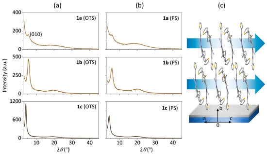 In order to correlate the characteristics of the OTFT devices based on derivatives 1a–c with the analyzed structural variations, the crystallinity and disposition within the thin films was evaluated by means of grazing incidence X-ray diffraction (GIXRD). The GIXRD patterns, illustrated in Figure 5a,b, are consistent with the tendency exhibited by the OTFT devices. The longer the N-alkyl chains, the sharper and more intense the diffraction peaks, which indicates a more prominent degree of order and crystallinity in the thin films. Comparing the nature of the passivation layer, the outperforming OTS-treated devices also provide more crystalline films than their PS analogs in derivatives 1b,c.