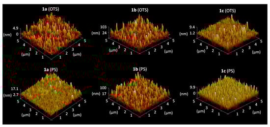 The N-methylated 1a provides a rather amorphous arrangement regardless of the passivation layer, agreeing with the lower OTFT performance and the small difference between OTS and PS. Nevertheless, the availability of the single-crystal structure of 1a permitted a closer insight into the arrangement of this material. From the simulated powder diffractogram, the diffraction signal peaking at 2θ = 5.52° could be assigned as the plane (010), which stands parallel to the substrate. As represented in Figure 5c, the π-system of 1a adopts a perpendicular disposition with respect to the substrate. Consequently, the π-stacking direction lays parallel to the substrate, ensuring a proper pathway for charge transport. The morphology of the vacuum-deposited thin films of 1a–c over OTS- and PS-treated substrates was analyzed by means of atomic force microscopy (AFM). The AFM images, depicted in Figure 6, reveal quite homogeneous layers with small protrusions or hillocks.