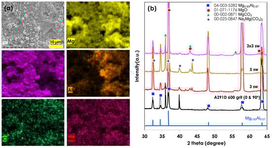 (a) SEM-EDS images of the CO2 AP-treated AZ91D (5 swings) and (b) XRD patterns of various CO2 AP-treated AZ91D specimens treated with different swings and 600 grit-finished reference. XRD patterns of untreated Mg were measured at two angles (0° and 90°) to avoid the crystalline directional effect. The 3 × 3 sw denotes 3 cross-swings (i.e., 3 horizontal swings and 3 vertical swings).