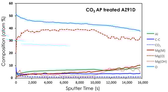 The XPS depth profiling of CO2 AP-treated AZ91D, as shown in Figure 3 and Table 2, indicated that the CO2 AP treatment left a layer of significant carbon (C–C) and carbonate (-CO3), formed on top of an existing thick MgO layer. Moreover, ~9 atom % of carbon existed after 16,000 s of sputtering.
