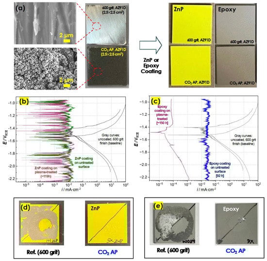 (a) SEM and photo image of 600 grit-treated and CO2 AP-treated AZ91D (5 swings, spaced 0.06 cm apart) and their ZnP primer coating; (b,c) potentiodynamic polarization measurements of the ZnP primer and the epoxy primer coated on CO2 AP-treated AZ91D 600 grit-finished reference AZ91D surfaces in a 3.5 wt.% NaCl solution after >90 h immersion. The inset photo shows the ZnP coating on a 2.5 cm × 2.5 cm AZ91D coupon. Also shown are two polarization curves of uncoated AZ91D surface with 600 grit finish. (d,e) The appearance of yellow ZnP and gray epoxy primers coated AZ91D samples (with 600 grit finish and CO2 AP treatment) after electrochemical evaluation in 3.5% NaCl solution for extended immersion time longer than 119 h. Coatings on 600 grit-finished surfaces were easily removed.