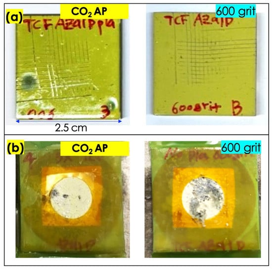 The third primer coatings (i.e., MIL23377) were applied on the CO2 AP-treated and reference surfaces. The measured thicknesses of the coatings on the CO2 AP-treated and the 600 grit-finished reference surfaces were 43.0 ± 2.8 μm (n = 5) and 43.3 ± 4.6 μm (n = 5), respectively. Crosshatch adhesion tests were conducted according to ASTM D3359 to quantify the coating adhesion. Figure 6a shows that both the CO2 AP specimen and the reference specimen had a fractional rate of ASTM class 5B, the highest coating adhesion rating. Then, a long-term salt spray test was also conducted to determine the coating adhesion and corrosion resistance. Figure 6b shows that the corrosion area of the CO2 AP specimen, by plan view visual inspection, was much smaller than that of the reference specimen, suggesting that the nano-/microrough Mg-O-C layer on AZ91D significantly enhanced the adhesive bonding of the primer, thereby mitigating corrosion.