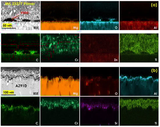 Cross-sectional SEM-EDS images with corresponding elemental maps for the MIL23377 primer-coated AZ91D surfaces after the salt spray test: (a) 600 grit-finished AZ91D and (b) air AP-treated AZ91D.