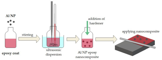 The obtained Al NPs were used to prepare nanocomposites of Al NP–epoxy coating. In this method, different concentrations of Al NPs (0.50, 0.75, and 1.0 wt.%) were added to the epoxy solution. The procedure for the epoxy coating modified by Al NP is illustrated in Figure 1.