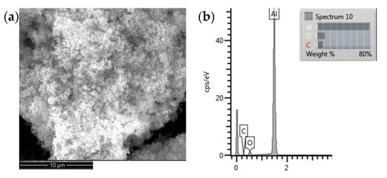 To detect the presence of the aluminium oxide film, EDS microanalysis was performed at a point on the surface of the powder sample obtained by the reaction between Al NPs and distilled water (Figure 5).