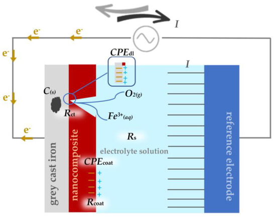 Figure 3 shows the electrochemical mechanism of corrosion destruction on the surface of grey cast iron, which is called graphitization. When the aggressive medium reaches the surface of grey cast iron, it will initiate the anodic dissolution of iron by leaving free graphite [35]. To slow down this process, the epoxy resin and the epoxy paint were modified with Al NPs, and tests were performed in a 3.5 wt.% NaCl solution using alternating current.