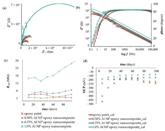 After 10 days, the epoxy paint showed the same resistance as the nanocomposite sample with 0.75% Al NPs. With a longer exposure time (after 50 days), the resistance of the blank epoxy gradually began to decrease (Figure 4c). Constant resistance values in all nanocomposite samples were maintained for 50 days, after which there was a slight increase in resistance in samples with 0.50% and 0.75% Al NPs, while the sample with 1.0% Al NPs showed a larger increase (Figure 4c). The obtained results indicated that it took 50 days to form an oxide film in the epoxy paint. The higher the concentration of nanoparticles, the greater the formation of the oxide film and the better the coating protection. Figure 4c shows that the highest resistance was achieved with the nanocomposite sample containing 1.0% Al NPs. This sample showed the highest resistance immediately at the beginning of the measurement. The increase in corrosion resistance could be attributed to a higher concentration of nanoparticles that created better adhesion and compatibility with the epoxy matrix, reduced the transport paths for the passage of corrosive electrolyte through the system coating, led to a decrease in the capacitance of the coating, and reduced corrosion reactions [16,30].
