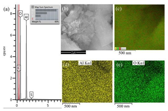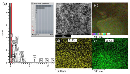 Results of (a) Surface spectrum, (b) SEM image, (c) collective colouring of surface maps of prepared aluminium oxide particles and partially coloured maps of the distribution of individual chemical elements in aluminium oxide particles: (d) Al K series, and (e) O K series.