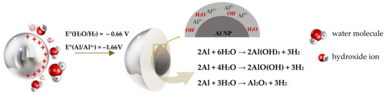 The oxidation process of a metal nanoparticle included two mechanisms, as shown in Figure 6. A nanoparticle in contact with an aqueous medium became electrically positively charged and, using van der Waals interactions, began to attract OH- ions and the negative polar part of the H2O molecule. After physical adsorption, due to the existence of a driving force (potential difference), Al NP oxidation and H2O reduction occurred. The resulting oxidized products together with the metal surface created a chemisorbed monolayer [39,40]. The aqueous solution was a weak electrolyte, which means that it consisted more of water molecules than ions, and thus the formed aluminium ions could react with water molecules (H2O) and form hydroxide ions (OH−) [38]. According to the literature, the first possible reaction product is Al(OH)3 (bayerite). The second possible reaction product is AlO(OH) (boehmite). The third possible reaction product is Al2O3 (alumina). These reactions are all thermodynamically favourable over a wide temperature range from room temperature to temperatures far above the melting point of aluminium (660 °C). In addition, all these reactions are highly exothermic [41]. The outer layer consisted of a mixture of Al2O3 and a hydrated layer, mostly in the form of amorphous Al(OH)3, while the inner part was mostly made of Al2O3 and a small amount of aluminium oxyhydroxide in the form of AlO(OH). Such a coating (Al2O3-AlO(OH)) was characterised by continuity and resistance to certain electrolytes (3.91 < pH < 8.64) [39]. The layers may have different thicknesses and chemical compositions depending on the methods used for the production and passivation of the powders [42]. The oxide layer thickness remained stable for at least 30 days, showing that the native oxide acted as a passivation layer preventing further oxidation [43]. Consolidation of inorganic fillers into the polymeric coating formulation can diminish porosity and draw out the lifetime of the composite coating [44].