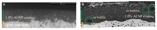 Grey cast iron plates with dimensions of 9.5 cm × 0.9 cm × 15 cm were used as substrates. The surface of the grey cast iron was cleaned with abrasive blasting and ethanol (70 wt.%). Two epoxy coatings were used in the work. The first coating was prepared using pure epoxy resin (Bisphenol A, West System, UK) and hardener (polyamine, West System, UK) in a ratio of 3.5 to 1. The second coating was prepared using epoxy paint (Hempel, Croatia) and hardener (polyamine, Hempel, Croatia) in a ratio of 4 to 1. Aluminium nanoparticles (Al NP) with an average particle size of 100 nm were provided by Guangzhou Hongwu Material Technology Co., Ltd., Guangzhou, China.