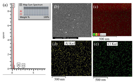 Results of (a) cross-sectional spectrum of the sample surface (b) SEM image of the sample surface (c) EDS cross-section map, and distribution of (d) aluminium and (e) chlorine in 1% Al NP–epoxy resin coating.