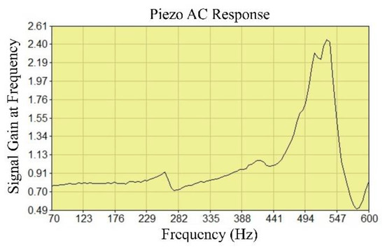 SECM provides electrochemical activity and topographic information about the surface reactions at the micrometre scale in aqueous environments [49]. We used this technique for the characterisation of the influence of the nanoparticles in the epoxy resin and epoxy paint. In the first experiment, it was necessary to find the appropriate vibration frequency so that the ultramicroelectrode (UME) could react with the surface (Figure 11). The piezo sensor was used to determine the distance of the UME from the surface of the sample. During the AC characterisation, the frequency applied to the piezo was automatically swept up to 600 Hz and the signal gain was recorded. The amplitude was 0.1.