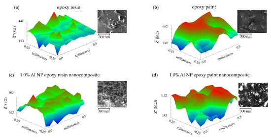 The real impedance measured was the result of the surface activity and constant distance between the UME and the sample surface. The measurements were performed in tap water (Figure 11). The topography of the surface was determined on samples that did not contain nanoparticles and on samples obtained by ultrasonic mixing of epoxy resin and epoxy paint with 1.0% Al NPs.
