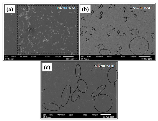 Cross-sectional SEM analysis of the cold spray additive manufactured Ni–20Cr thick plates: (a) As-sprayed; (b) Substrate heated; (c) Hot-isostatic pressing treated, pores in the microstructures are encircled.
