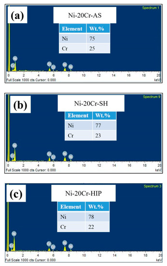 Cross-sectional SEM images of Ni–20Cr-AS, Ni–20Cr-SH, and Ni–20Cr-HIP have been represented in Figure 7a, Figure 7b, and Figure 7c, respectively. Moreover, the comparison of density, apparent surface porosity, and pore size distribution has been represented in Figure 8. The pores/voids were large in numbers, and size was of the order of 2–10 µm in the Ni–20Cr-AS (Figure 7a), which resulted in 9.54% apparent surface porosity (calculated from Image-J analysis) and lesser density of the magnitude of 6.43 g/cc (calculated by Archimedes principle using density measuring kit) as compared to the density of bulk Ni–20Cr alloy (8.3 g/cc). Comparatively smaller pores of the order of 1–3 µm have been observed in Ni–20Cr-SH (Figure 7b) with 6.36% apparent surface porosity. The density of the sample (7.36 g/cc) was observed better than Ni–20Cr-AS but lesser than the bulk material. However, a surface with the least defects (porosity and voids) was observed for Ni–20Cr-HIP samples (as represented in Figure 7c). The least apparent surface porosity having a value of 2.43% and the best density of the order of 8.14 g/cc were achieved with HIP treatment. A pore size in the range of 1–4 µm was observed as comparatively bigger than Ni–20Cr-SH. It can be perceived from Figure 7 and Figure 8 that HIP treatment improved the microstructure by reducing the porosity and improving the density by 75% and 27%, respectively. EDS spectra of Ni–20Cr-AS, Ni–20Cr-SH, and Ni–20Cr-HIP deposits are represented in Figure 9a, Figure 9b, and Figure 9c, respectively. There is a small difference in the elemental compositions of all three samples that might be due to some measurement error. The elemental composition showed the absence of oxygen and the presence of a mixture of nickel and chromium in all the deposited specimens. The same has also been supported by XRD analysis as represented in Figure 5.
