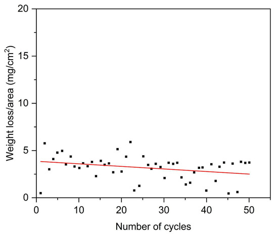 It was observed from the initial characterization results that Ni–20Cr-SH has the best properties approaching the bulk material among all the investigated cases. Therefore, to study its sustainability at high temperatures, a cyclic oxidation study for the Ni–20Cr-SH deposit was performed. The weight change data for the deposit are given in Figure 12 and Figure 13, which establish that the weight loss has shown a tendency to become stabilized with minor deviations. However, the overall weight loss by the sample at the end of the 50th cycle has been observed as marginal (3.684 mg/cm2), which demonstrates its stability at high-temperature applications.
