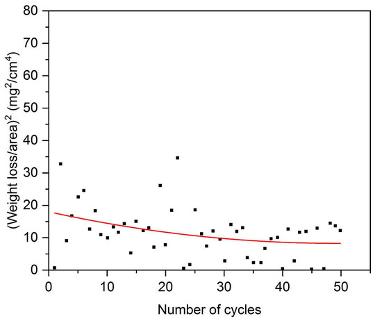 Plot of (weight loss/area)2 vs. number of cycles for the cold spray additive manufactured Ni–20Cr thick plate in substrate heated condition (Ni–20Cr-SH) exposed to 50 cycles of high-temperature cyclic oxidation in air at 900 °C.