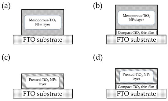 Four different photoanode structures were integrated, including a mesoporous TiO2 NPs layer, a mesoporous TiO2 NPs layer stacked on the compact TiO2 thin film, a pressed TiO2 NPs layer, and a pressed TiO2 NPs layer stacked on the compact TiO2 thin film (Figure 1) [17].
