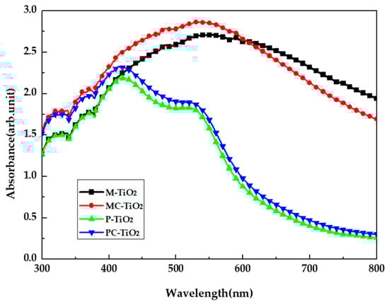 Figure 4 shows the UV-Vis absorption spectra of four different photoanodes after immersion in N3 dye. The photoanodes based on the mesoporous TiO2 NPs layer and that on the compact TiO2 thin film have a wider UV absorption bandwidth than the photoanode based on other TiO2 layers. Its best absorption occurs at the wavelength of about 540 nm. The wider bandwidth can be explained by the scattering effects that enhance light absorption due to the thicker and looser structure of the mesoporous TiO2 NPs layer. The photoanodes based on the pressed TiO2 NPs layer and that on the compact TiO2 thin film has a narrower light absorption bandwidth and show the best and second-best absorption at 420 nm and 530 nm, respectively. Two absorption peaks observed at 420 and 530 nm are attributed to the light absorption properties of TiO2 and N3 dye, respectively [21]. Compared with the mesoporous TiO2 NPs layer, the pressed TiO2 NPs layer has a narrower light absorption bandwidth, as the thinner layer allows the light of a longer wavelength to pass through more easily, resulting in lower light absorption.