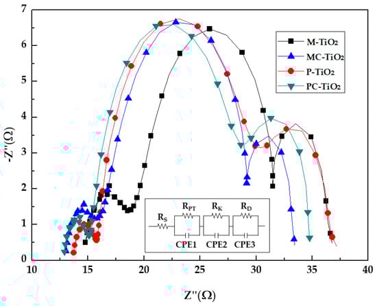 Nyquist plots and equivalent circuits of DSSCs with photoanodes based on four different TiO2 layers. (RS: series resistance of wires and bulk. RPT: electrochemical reaction at the platinum counter electrode and electrolyte interface. RD: Warburg diffusion process of / in the electrolyte. RK: charge transport through the TiO2, dye, and electrolyte interfaces. CPE1: interface capacitance at platinum counter electrode and electrolyte interface. CPE2: interface capacitance at TiO2, dye, and electrolyte interfaces. CPE3: constant phase element of charge transport through the TiO2, dye, and electrolyte interfaces [23]).