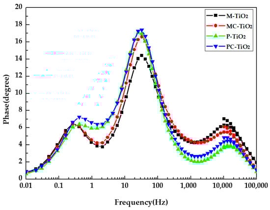 EIS analysis results are shown in Table 1 and Figure 5 and Figure 6. The Nyquist plot and Bode plot of DSSC with photoanodes based on different TiO2 layers are shown in Figure 5 and Figure 6, respectively. In the plots, the horizontal axis is for the real part of the impedance, Z′(Ω), while the vertical axis is for the imaginary part of the impedance, Z″(Ω), with the frequency swept from 10 MHz to 100 kHz. The Nyquist plot in Figure 5 shows three curves. The maximum frequency, fmax is shown at the top of the middle curve. The electron lifetime (τeff) in the TiO2 layer is expressed by the reciprocal of fmax multiplied by 2π [22]. The structure of the TiO2 layer affects RK and τeff. However, RK involves more components that are difficult to analyze, so electron lifetime needs to be paid more attention to. The electron lifetime was 8.217 ms and 6.287 ms for DSSCs with photoanodes based on the pressed TiO2 NPs layer and the mesoporous TiO2 NPs layer. The longer electron lifetime in DSSC based on the pressed TiO2 NPs layer implies a lower density of the layer in the working electrode. The lower density leads to the effective suppression of the recombination effect between the electrons injected into the conduction band of the pressed TiO2 NPs layer on the compact layer and the / ions at the FTO surface [23]. Figure 6 shows that there is not much difference in the frequency of characteristic peaks appearing in DSSC based on four different photoanodes.