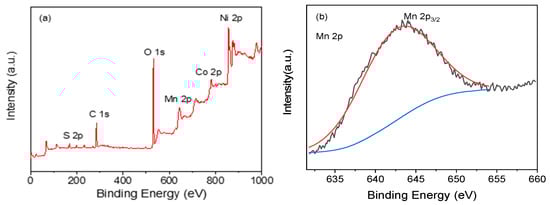The chemical element composition and the valence state of the MnCoS-CTAB materials were analyzed by XPS. Figure 4a is the XPS spectrum of the survey scanning, indicating that the Co, Mn, S, Ni, and O elements were detected; the appearance of oxygen arose due to the oxidation of the MnCoS-CTAB sample after exposure to the air; and the Ni element was inevitably detected from the nickel foam. In the high-resolution spectrum of Mn 2p (Figure 4b), it was observed that the Mn 2p peak at a binding energy of 642.5 eV was attributed to Mn 2p3/2 [22,23], and no other peaks appeared, indicating that the Mn element existed only in the form of Mn2+. Figure 4c shows that the Co 2p peak consisted of two spin-orbit splitting peaks and two restructured satellites peaks, and the peaks at a binding energy of 786.9 eV and 802.4 eV belonged to Co2+, and the peaks at 781.3 eV and 797.3 eV corresponded to Co3+ [25,26], indicating that the Co existed in the form of Co2+ and Co3+, of which Co2+ was the main one. The coexistence of the mixed valence states of Co provided a variety of redox reaction types, which contributed to the excellent electrochemical performance. Figure 4d indicates that the S 2p peak contained two peaks at binding energy peaks of 162.9 eV and168.6 eV, the peak at 162.9 eV was consistent with MnS and CoS, and the satellite peak of sulfide was observed at 168.8 eV [27,38].