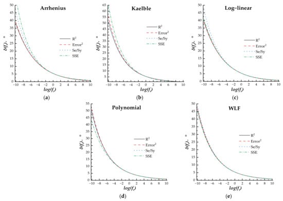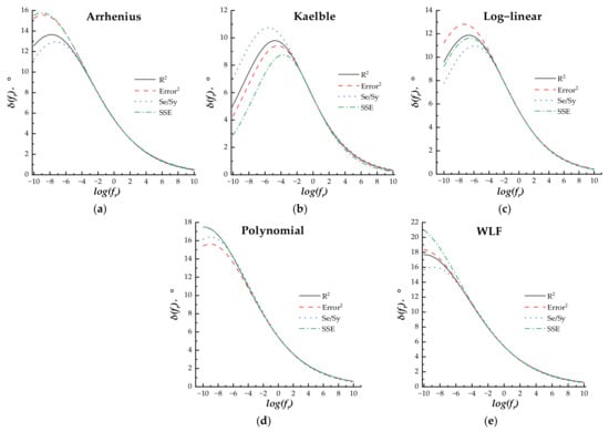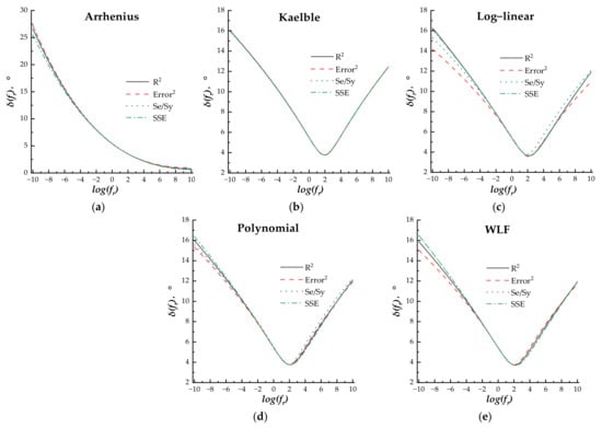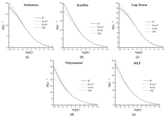 The master curve of Model 1 fitting results with different error minimization methods. (a) Arrhenius equation; (b) Kaelble equation; (c) Log-linear equation; (d) Polynomial equation; (e) WLF equation.