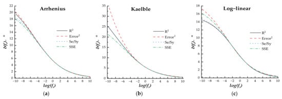 Equation (11) shows the Arrhenius equation [] which is used for calculating the shift factor: