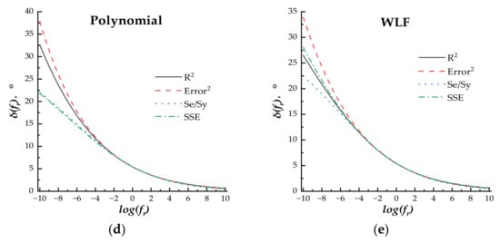 The phase angle master curve fitting results of Model 2 combined with five different shift factor equations under four error minimization methods are plotted in Figure 8. In each picture, the phase angle master curves of each shift factor equation are combined to compare the influence of the error minimization method on the fitting results.