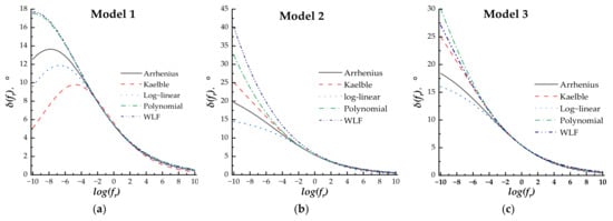 It is also worth noting that the sigmoidal structure is absent from the mathematical expression of Model 3 [,]. The exponential-based function shown by Equations (2) and (3) present a smooth bell-shaped curve when used to fit data. However, as can be seen in Equation (4), Model 3 provides [] a combination of logarithm and exponential functions that deviates from a bell-shaped pattern. Therefore, this means that the phase angle master curves may be remarkably different from the ones generated by Models 1 and 2.
