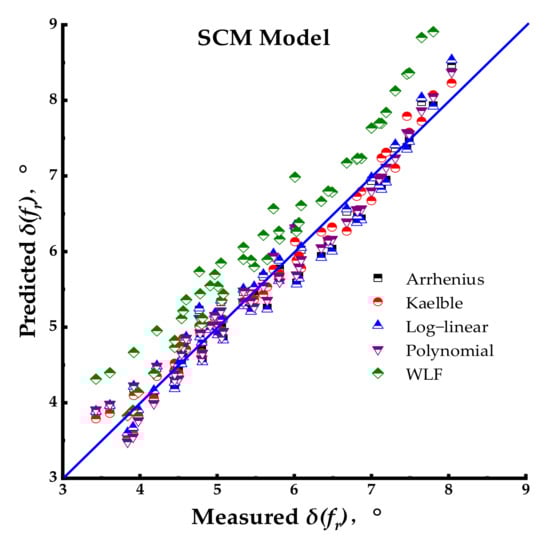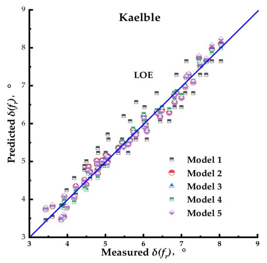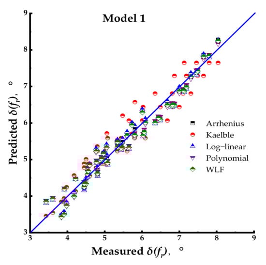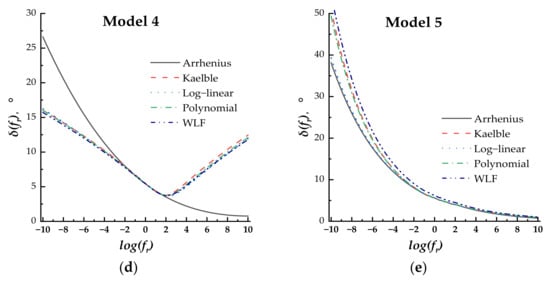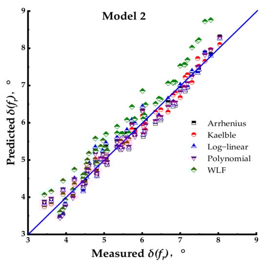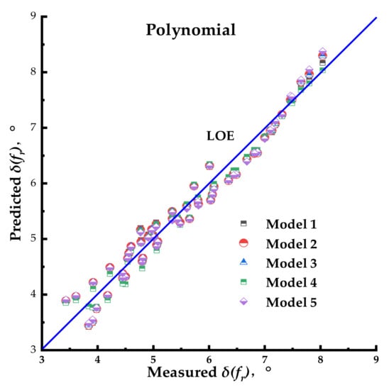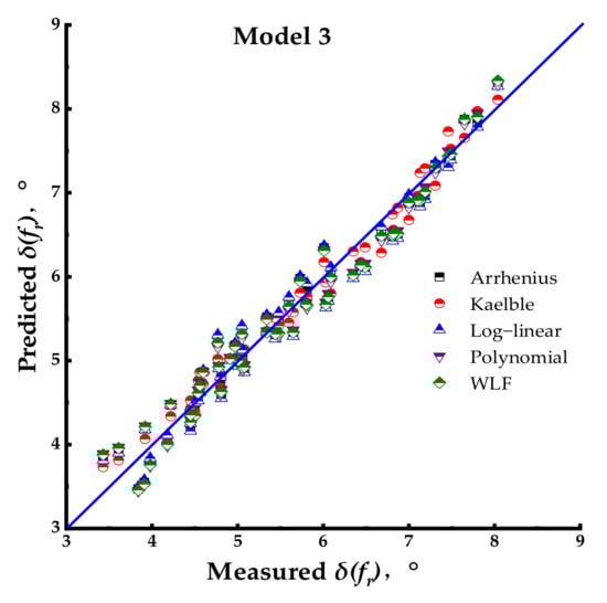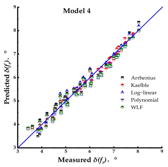 It needs to be mentioned that Model 4 does not take into consideration the straightforward relationship between the phase angle and the corresponding phase angle, as shown in []. This model’s fundamental drawback is that the equation for the phase angle relies on an empirical approximation because of the varying values in Equation (5). However, a better fitting of the experimental results was observed compared to Model 3 in different studies [,], likely as a consequence of the increased number of parameters.