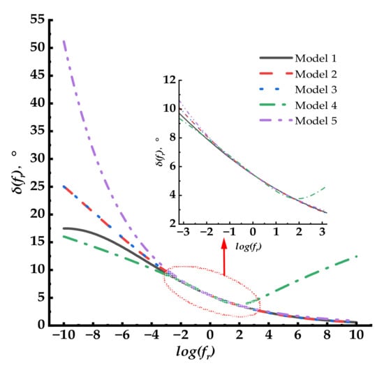 - For all the phase angle master curves, Model 5 had the highest values, Models 2 and 3 had the same trend, Model 1 had the lowest value, and all four models decreased monotonously with the increase in the loading frequency. Model 4 first decreased and then increased with the increase in the loading frequency. When the loading frequency ranged between 10−3 and 103 Hz, all the master curve models exhibited insignificant differences.