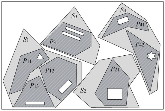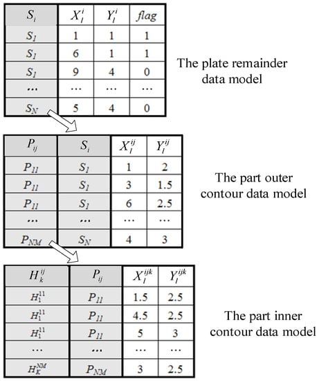 According to the part-cutting constraint rule of inside-contour priority, all the inside contours of the parts that need to be cut must be identified to optimize the cutting path; however, it is difficult because of the coexistence of the plate-remainder contours, the part outer contours, and the part inner contours. To express the graph information, a three-layer graphical data model was proposed, as shown in Figure 2, which includes the plate-remainder data model, the part-outer-contour data model, and the part-inner-contour data model.