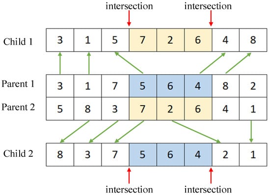 Sequential crossover, consistent crossover, rotating crossover, and other crossover techniques are frequently employed in genetic algorithms. The method of sequential crossover is used in this paper. The genes between the two intersections in the paternal individual remain unchanged, and the rest of the genes are filled according to the sequence of genes in the other paternal individual if the genes that have already been selected are no longer selected. Each time the procedure is used, two new offspring can be formed. For example, two paternal individuals are: (3,1,7,/5,6,4,/8,2) and (5,8,3,/7,2,6,/4,1), where “/” represents the two randomly generated intersections. According to the method (as illustrated in Figure 3), the progeny individuals are (8,3,7,5,6,4,2,1) and (3,1,5,7,2,6,4,8).