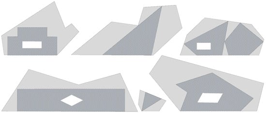 A standard system of linear equations is given in Formula (7). The six parameters , , , , , and can be easily obtained (the solution process is abbreviated), and the geometric transformation matrix of the plate remainder is obtained. Because their relative position remains unchanged, the new geometric coordinates of the shape to be cut in the plate remainder can be derived by . In the graphical data model, the original coordinate matrices of the outer and inner contour vertices of all parts in the plate remainder are recorded as and , respectively, and their new coordinate matrices after layout correspondingly are recorded as and , respectively. Using Formula (3), we can obtain
