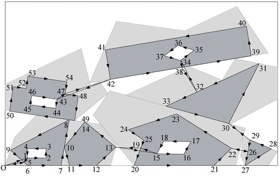 By using the six plate remainders to be cut as an example, the feasibility and effectiveness of the method presented in this study were verified, as shown in Figure 6. Due to space limitations, the three-layer graphical data model for each plate remainder and its parts were omitted. The combination layout of the six plate remainders (as shown in Figure 7) was created using the optimization method for the combination layout and the internal-figure geometric transformation of plate remainders. The operation path of the laser head was optimized using the ant colony algorithm-based cutting-path optimization algorithm with parameters , , , , . The optimization program was compiled by Matlab, and the best cutting path of the laser head (as shown in Figure 8) was obtained after running 20 times.