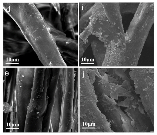 SEM images of raw (left) and TiO2-/stearic-acid-coated samples (right): (a–e) sawdust, wheat straw, sponge, cotton and fabric; (f–j) TiO2-/stearic-acid-coated samples.