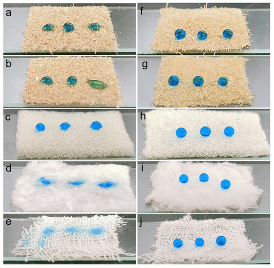 Photographs of water droplets on pristine (left) and TiO2-/stearic-acid-coated samples (right): (a–e) sawdust, wheat straw, sponge, cotton and fabric; (f–j) TiO2-/stearic-acid-coated samples.