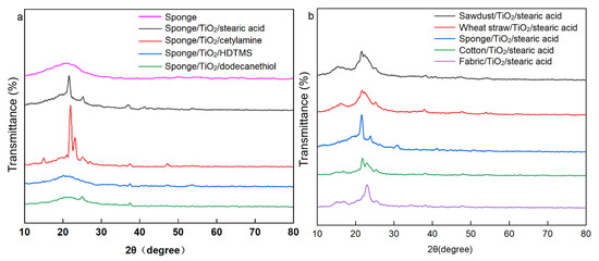 The XRD spectra of superhydrophobic sponge with different low-surface-energy substances (a) and TiO2-/stearic-acid-coated samples (b).