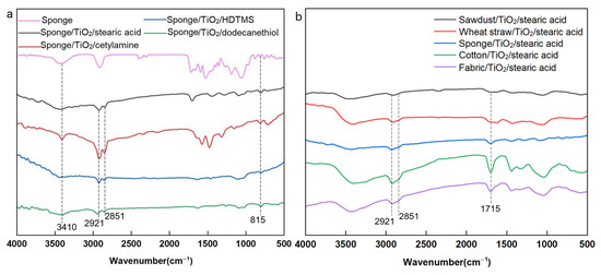 FTIR spectrum of superhydrophobic sponges with different low-surface-energy substances (a) and TiO2-/stearic-acid-coated samples (b).
