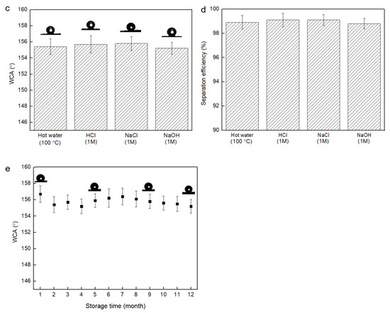 Various corrosion solutions have been used to test the chemical stability of superhydrophobic sponges. As illustrated in Figure 8c, the WCA values of 5 μL of hot water (100 °C), 1 M of HCl solution, 1 M of NaCl solution and 1 M of NaOH solution were all larger than 155°, demonstrating stable superhydrophobicity toward extreme liquids. This is because the air trapped on the sponge’s surface has resistance to acidic, alkaline and high-temperature environments. Furthermore, the separation capacity of the coated sponge for these corrosive solutions with tetrachloromethane was subsequently evaluated. The tetrachloromethane quickly penetrated the coated sponge, leaving the aqueous solutions above the sponge. As displayed in Figure 8d, the separation efficiency remained above 98% for all the harsh environments, demonstrating remarkable performance for oil/water separation. The sponge/TiO2/stearic acid was stored under ambient conditions for 12 months, and its stability was subsequently tested. As depicted in Figure 8e, the WCA values of the coated sponges were all larger than 155°. These results indicated that the coated sponges possessed good durability, providing the basis for their application.