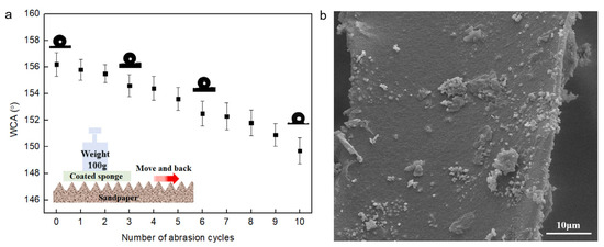 In our daily lives, superwetting materials are usually exposed to complex and harsh environments. Thus, it is necessary to improve the durability of superwetting materials [41,45,46]. To test the effects of abrasion, the sponge/TiO2/stearic acid was placed on sandpaper with 1000 meshes and was moved forth and back for a distance of 20 cm under a weight of 100 g. As displayed in Figure 8a, the WCA decreased from 156.2° to 149.7° after 10 abrasion cycles. The WCA decreased because some of the micro-/nanoscale structure was lost after abrasion. However, the TiO2 nanoparticles still closely covered the sponge, which retained high hydrophobicity after abrasion (Figure 8b). The remarkable abrasion resistance of the coated sponge comes mainly from the strong adherence of the TiO2 nanoparticles.