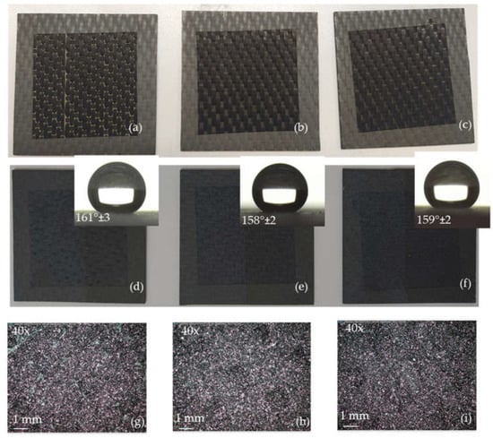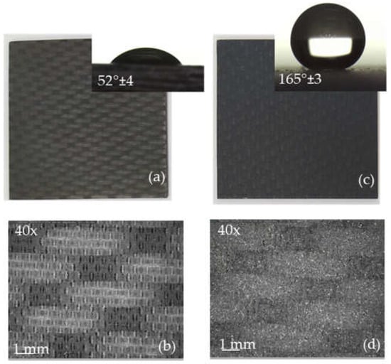 Figure 2a,c shows the pictures of pristine (P) and coated samples (C), respectively, along with the images of 3 μL water droplets and the measured values of water contact angles (WCA). It highlights that after the application of the SHC the WCA increased from 52 to 165°, the wettability of surface was consequently reduced. The optical images at 40× of magnification show that the weave of CFRP substrates remained visible also after the application of the coating (Figure 2b,d).