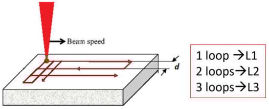 In Table 1, the laser parameters exploited for the texturing of the pristine substrate are reported. Three different samples were texturized, keeping fix all the parameters except for the number of consecutive loops. The beam was moved through the scanner following the cross-hatched path in Figure 3.