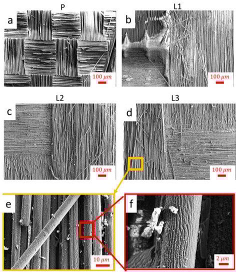 In Figure 4, the SEM images of the samples after laser micromachining are compared with the pristine one. As can be seen from Figure 1b, a single loop was not enough to obtain a homogeneous surface, as residues of the epoxy resin layer remain. On the contrary, two and three loops allowed to completely uncover the texture of the fibres (Figure 4c,d). In Figure 4e,f, the surfaces machined after three laser passages were reported at two different magnifications. Although some more superficial fibres were broken, their surface structure was not affected by the passage of the laser.